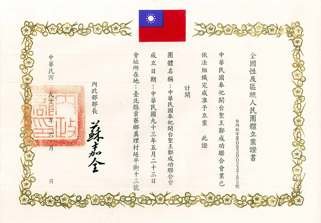 接任第三屆理事長鄭芳草先生,為祈求本會永續發展光大,及闡揚開台聖王護國濟世愛民偉大精神,擬成立全國性立案社團。業經行政院內政部93年1月29日函文准予籌組,同年民國93年2月8日於花蓮縣新城鄉廣安宮召開聯合總會理監事會議,成立發起人會議,並推舉社團法人中華民國濟世功德會吳榮華先生為籌備會主任委員,歷經二次籌備會議及全國五次地區座談會,得以民國93年5月23日假台北市麒麟大飯店正式成立『社團法人中華民國奉祀開台聖王鄭成功聯合會』,同時為『全國奉祀開台聖王廟宇聯合總會』,創立15年來完成階段性的使命,並選出台北縣貢寮鄉慶安宮主任委員簡慶雄先生,為改制後社團法人中華民國奉祀開台聖王鄭成功聯合會第一屆理事長,聘請林瑞芳為秘書長。民國97年5月26日連任第二屆理事長,續聘林瑞芳為秘書長至民國101年5月25日止。